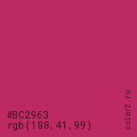 Цвет #BC2963 в цветовой модели RGB обозначается тремя октетами (188, 41, 99) в десятичном формате и #BC2963 в шестнадцатиричном (hex) формате, которые являются интенсивностью красного 188 (hex BC), интенсивность зелёного 41 (hex 29) и интенсивность синего 99 (hex 63).