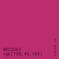 Цвет #BC2D6D в цветовой модели RGB обозначается тремя октетами (188, 45, 109) в десятичном формате и #BC2D6D в шестнадцатиричном (hex) формате, которые являются интенсивностью красного 188 (hex BC), интенсивность зелёного 45 (hex 2D) и интенсивность синего 109 (hex 6D).