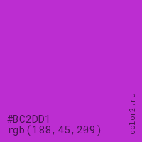 Цвет #BC2DD1 в цветовой модели RGB обозначается тремя октетами (188, 45, 209) в десятичном формате и #BC2DD1 в шестнадцатиричном (hex) формате, которые являются интенсивностью красного 188 (hex BC), интенсивность зелёного 45 (hex 2D) и интенсивность синего 209 (hex D1).