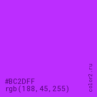 Цвет #BC2DFF в цветовой модели RGB обозначается тремя октетами (188, 45, 255) в десятичном формате и #BC2DFF в шестнадцатиричном (hex) формате, которые являются интенсивностью красного 188 (hex BC), интенсивность зелёного 45 (hex 2D) и интенсивность синего 255 (hex FF).