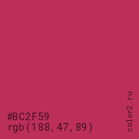 Цвет #BC2F59 в цветовой модели RGB обозначается тремя октетами (188, 47, 89) в десятичном формате и #BC2F59 в шестнадцатиричном (hex) формате, которые являются интенсивностью красного 188 (hex BC), интенсивность зелёного 47 (hex 2F) и интенсивность синего 89 (hex 59).