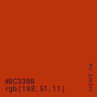 Цвет #BC330B в цветовой модели RGB обозначается тремя октетами (188, 51, 11) в десятичном формате и #BC330B в шестнадцатиричном (hex) формате, которые являются интенсивностью красного 188 (hex BC), интенсивность зелёного 51 (hex 33) и интенсивность синего 11 (hex 0B).