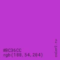Цвет #BC36CC в цветовой модели RGB обозначается тремя октетами (188, 54, 204) в десятичном формате и #BC36CC в шестнадцатиричном (hex) формате, которые являются интенсивностью красного 188 (hex BC), интенсивность зелёного 54 (hex 36) и интенсивность синего 204 (hex CC).