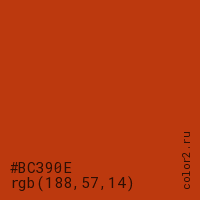 Цвет #BC390E в цветовой модели RGB обозначается тремя октетами (188, 57, 14) в десятичном формате и #BC390E в шестнадцатиричном (hex) формате, которые являются интенсивностью красного 188 (hex BC), интенсивность зелёного 57 (hex 39) и интенсивность синего 14 (hex 0E).