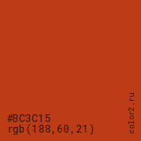 Цвет #BC3C15 в цветовой модели RGB обозначается тремя октетами (188, 60, 21) в десятичном формате и #BC3C15 в шестнадцатиричном (hex) формате, которые являются интенсивностью красного 188 (hex BC), интенсивность зелёного 60 (hex 3C) и интенсивность синего 21 (hex 15).
