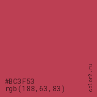 Цвет #BC3F53 в цветовой модели RGB обозначается тремя октетами (188, 63, 83) в десятичном формате и #BC3F53 в шестнадцатиричном (hex) формате, которые являются интенсивностью красного 188 (hex BC), интенсивность зелёного 63 (hex 3F) и интенсивность синего 83 (hex 53).