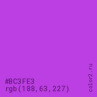Цвет #BC3FE3 в цветовой модели RGB обозначается тремя октетами (188, 63, 227) в десятичном формате и #BC3FE3 в шестнадцатиричном (hex) формате, которые являются интенсивностью красного 188 (hex BC), интенсивность зелёного 63 (hex 3F) и интенсивность синего 227 (hex E3).