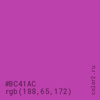 Цвет #BC41AC в цветовой модели RGB обозначается тремя октетами (188, 65, 172) в десятичном формате и #BC41AC в шестнадцатиричном (hex) формате, которые являются интенсивностью красного 188 (hex BC), интенсивность зелёного 65 (hex 41) и интенсивность синего 172 (hex AC).