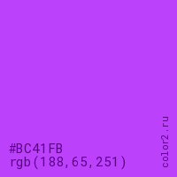 Цвет #BC41FB в цветовой модели RGB обозначается тремя октетами (188, 65, 251) в десятичном формате и #BC41FB в шестнадцатиричном (hex) формате, которые являются интенсивностью красного 188 (hex BC), интенсивность зелёного 65 (hex 41) и интенсивность синего 251 (hex FB).