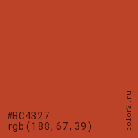 Цвет #BC4327 в цветовой модели RGB обозначается тремя октетами (188, 67, 39) в десятичном формате и #BC4327 в шестнадцатиричном (hex) формате, которые являются интенсивностью красного 188 (hex BC), интенсивность зелёного 67 (hex 43) и интенсивность синего 39 (hex 27).