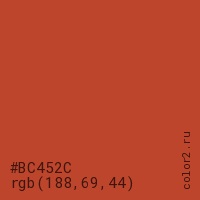 Цвет #BC452C в цветовой модели RGB обозначается тремя октетами (188, 69, 44) в десятичном формате и #BC452C в шестнадцатиричном (hex) формате, которые являются интенсивностью красного 188 (hex BC), интенсивность зелёного 69 (hex 45) и интенсивность синего 44 (hex 2C).
