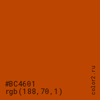 Цвет #BC4601 в цветовой модели RGB обозначается тремя октетами (188, 70, 1) в десятичном формате и #BC4601 в шестнадцатиричном (hex) формате, которые являются интенсивностью красного 188 (hex BC), интенсивность зелёного 70 (hex 46) и интенсивность синего 1 (hex 01).