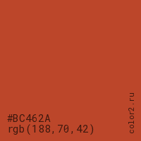 Цвет #BC462A в цветовой модели RGB обозначается тремя октетами (188, 70, 42) в десятичном формате и #BC462A в шестнадцатиричном (hex) формате, которые являются интенсивностью красного 188 (hex BC), интенсивность зелёного 70 (hex 46) и интенсивность синего 42 (hex 2A).