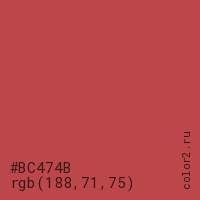 Цвет #BC474B в цветовой модели RGB обозначается тремя октетами (188, 71, 75) в десятичном формате и #BC474B в шестнадцатиричном (hex) формате, которые являются интенсивностью красного 188 (hex BC), интенсивность зелёного 71 (hex 47) и интенсивность синего 75 (hex 4B).