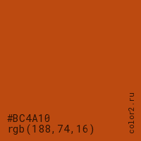 Цвет #BC4A10 в цветовой модели RGB обозначается тремя октетами (188, 74, 16) в десятичном формате и #BC4A10 в шестнадцатиричном (hex) формате, которые являются интенсивностью красного 188 (hex BC), интенсивность зелёного 74 (hex 4A) и интенсивность синего 16 (hex 10).