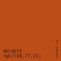 Цвет #BC4D19 в цветовой модели RGB обозначается тремя октетами (188, 77, 25) в десятичном формате и #BC4D19 в шестнадцатиричном (hex) формате, которые являются интенсивностью красного 188 (hex BC), интенсивность зелёного 77 (hex 4D) и интенсивность синего 25 (hex 19).