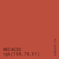 Цвет #BC4E3D в цветовой модели RGB обозначается тремя октетами (188, 78, 61) в десятичном формате и #BC4E3D в шестнадцатиричном (hex) формате, которые являются интенсивностью красного 188 (hex BC), интенсивность зелёного 78 (hex 4E) и интенсивность синего 61 (hex 3D).