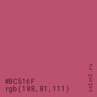 Цвет #BC516F в цветовой модели RGB обозначается тремя октетами (188, 81, 111) в десятичном формате и #BC516F в шестнадцатиричном (hex) формате, которые являются интенсивностью красного 188 (hex BC), интенсивность зелёного 81 (hex 51) и интенсивность синего 111 (hex 6F).