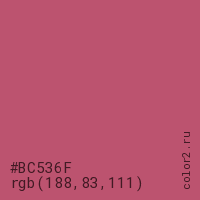 Цвет #BC536F в цветовой модели RGB обозначается тремя октетами (188, 83, 111) в десятичном формате и #BC536F в шестнадцатиричном (hex) формате, которые являются интенсивностью красного 188 (hex BC), интенсивность зелёного 83 (hex 53) и интенсивность синего 111 (hex 6F).