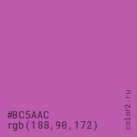 Цвет #BC5AAC в цветовой модели RGB обозначается тремя октетами (188, 90, 172) в десятичном формате и #BC5AAC в шестнадцатиричном (hex) формате, которые являются интенсивностью красного 188 (hex BC), интенсивность зелёного 90 (hex 5A) и интенсивность синего 172 (hex AC).