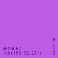 Цвет #BC5CE7 в цветовой модели RGB обозначается тремя октетами (188, 92, 231) в десятичном формате и #BC5CE7 в шестнадцатиричном (hex) формате, которые являются интенсивностью красного 188 (hex BC), интенсивность зелёного 92 (hex 5C) и интенсивность синего 231 (hex E7).