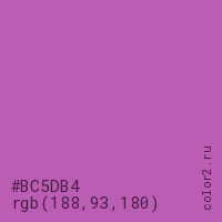 Цвет #BC5DB4 в цветовой модели RGB обозначается тремя октетами (188, 93, 180) в десятичном формате и #BC5DB4 в шестнадцатиричном (hex) формате, которые являются интенсивностью красного 188 (hex BC), интенсивность зелёного 93 (hex 5D) и интенсивность синего 180 (hex B4).