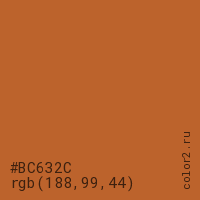 Цвет #BC632C в цветовой модели RGB обозначается тремя октетами (188, 99, 44) в десятичном формате и #BC632C в шестнадцатиричном (hex) формате, которые являются интенсивностью красного 188 (hex BC), интенсивность зелёного 99 (hex 63) и интенсивность синего 44 (hex 2C).