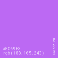 Цвет #BC69F3 в цветовой модели RGB обозначается тремя октетами (188, 105, 243) в десятичном формате и #BC69F3 в шестнадцатиричном (hex) формате, которые являются интенсивностью красного 188 (hex BC), интенсивность зелёного 105 (hex 69) и интенсивность синего 243 (hex F3).
