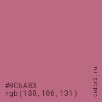 Цвет #BC6A83 в цветовой модели RGB обозначается тремя октетами (188, 106, 131) в десятичном формате и #BC6A83 в шестнадцатиричном (hex) формате, которые являются интенсивностью красного 188 (hex BC), интенсивность зелёного 106 (hex 6A) и интенсивность синего 131 (hex 83).