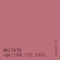 Цвет #BC707B в цветовой модели RGB обозначается тремя октетами (188, 112, 123) в десятичном формате и #BC707B в шестнадцатиричном (hex) формате, которые являются интенсивностью красного 188 (hex BC), интенсивность зелёного 112 (hex 70) и интенсивность синего 123 (hex 7B).