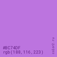 Цвет #BC74DF в цветовой модели RGB обозначается тремя октетами (188, 116, 223) в десятичном формате и #BC74DF в шестнадцатиричном (hex) формате, которые являются интенсивностью красного 188 (hex BC), интенсивность зелёного 116 (hex 74) и интенсивность синего 223 (hex DF).