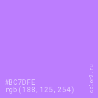 Цвет #BC7DFE в цветовой модели RGB обозначается тремя октетами (188, 125, 254) в десятичном формате и #BC7DFE в шестнадцатиричном (hex) формате, которые являются интенсивностью красного 188 (hex BC), интенсивность зелёного 125 (hex 7D) и интенсивность синего 254 (hex FE).