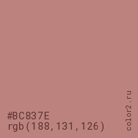 Цвет #BC837E в цветовой модели RGB обозначается тремя октетами (188, 131, 126) в десятичном формате и #BC837E в шестнадцатиричном (hex) формате, которые являются интенсивностью красного 188 (hex BC), интенсивность зелёного 131 (hex 83) и интенсивность синего 126 (hex 7E).