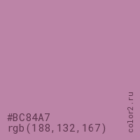 Цвет #BC84A7 в цветовой модели RGB обозначается тремя октетами (188, 132, 167) в десятичном формате и #BC84A7 в шестнадцатиричном (hex) формате, которые являются интенсивностью красного 188 (hex BC), интенсивность зелёного 132 (hex 84) и интенсивность синего 167 (hex A7).