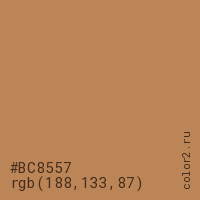 Цвет #BC8557 в цветовой модели RGB обозначается тремя октетами (188, 133, 87) в десятичном формате и #BC8557 в шестнадцатиричном (hex) формате, которые являются интенсивностью красного 188 (hex BC), интенсивность зелёного 133 (hex 85) и интенсивность синего 87 (hex 57).