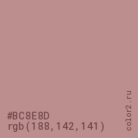 Цвет #BC8E8D в цветовой модели RGB обозначается тремя октетами (188, 142, 141) в десятичном формате и #BC8E8D в шестнадцатиричном (hex) формате, которые являются интенсивностью красного 188 (hex BC), интенсивность зелёного 142 (hex 8E) и интенсивность синего 141 (hex 8D).