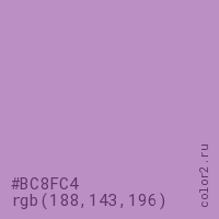 Цвет #BC8FC4 в цветовой модели RGB обозначается тремя октетами (188, 143, 196) в десятичном формате и #BC8FC4 в шестнадцатиричном (hex) формате, которые являются интенсивностью красного 188 (hex BC), интенсивность зелёного 143 (hex 8F) и интенсивность синего 196 (hex C4).