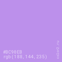 Цвет #BC90EB в цветовой модели RGB обозначается тремя октетами (188, 144, 235) в десятичном формате и #BC90EB в шестнадцатиричном (hex) формате, которые являются интенсивностью красного 188 (hex BC), интенсивность зелёного 144 (hex 90) и интенсивность синего 235 (hex EB).