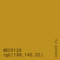Цвет #BC9120 в цветовой модели RGB обозначается тремя октетами (188, 145, 32) в десятичном формате и #BC9120 в шестнадцатиричном (hex) формате, которые являются интенсивностью красного 188 (hex BC), интенсивность зелёного 145 (hex 91) и интенсивность синего 32 (hex 20).