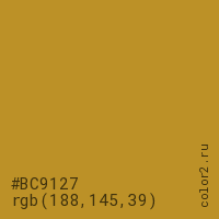 Цвет #BC9127 в цветовой модели RGB обозначается тремя октетами (188, 145, 39) в десятичном формате и #BC9127 в шестнадцатиричном (hex) формате, которые являются интенсивностью красного 188 (hex BC), интенсивность зелёного 145 (hex 91) и интенсивность синего 39 (hex 27).