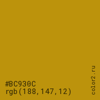 Цвет #BC930C в цветовой модели RGB обозначается тремя октетами (188, 147, 12) в десятичном формате и #BC930C в шестнадцатиричном (hex) формате, которые являются интенсивностью красного 188 (hex BC), интенсивность зелёного 147 (hex 93) и интенсивность синего 12 (hex 0C).