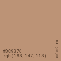 Цвет #BC9376 в цветовой модели RGB обозначается тремя октетами (188, 147, 118) в десятичном формате и #BC9376 в шестнадцатиричном (hex) формате, которые являются интенсивностью красного 188 (hex BC), интенсивность зелёного 147 (hex 93) и интенсивность синего 118 (hex 76).