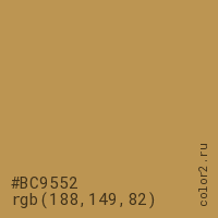 Цвет #BC9552 в цветовой модели RGB обозначается тремя октетами (188, 149, 82) в десятичном формате и #BC9552 в шестнадцатиричном (hex) формате, которые являются интенсивностью красного 188 (hex BC), интенсивность зелёного 149 (hex 95) и интенсивность синего 82 (hex 52).