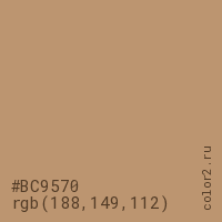Цвет #BC9570 в цветовой модели RGB обозначается тремя октетами (188, 149, 112) в десятичном формате и #BC9570 в шестнадцатиричном (hex) формате, которые являются интенсивностью красного 188 (hex BC), интенсивность зелёного 149 (hex 95) и интенсивность синего 112 (hex 70).