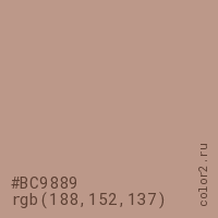 Цвет #BC9889 в цветовой модели RGB обозначается тремя октетами (188, 152, 137) в десятичном формате и #BC9889 в шестнадцатиричном (hex) формате, которые являются интенсивностью красного 188 (hex BC), интенсивность зелёного 152 (hex 98) и интенсивность синего 137 (hex 89).