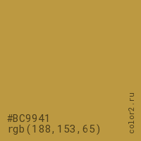 Цвет #BC9941 в цветовой модели RGB обозначается тремя октетами (188, 153, 65) в десятичном формате и #BC9941 в шестнадцатиричном (hex) формате, которые являются интенсивностью красного 188 (hex BC), интенсивность зелёного 153 (hex 99) и интенсивность синего 65 (hex 41).