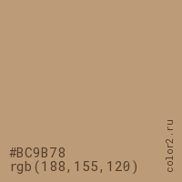 Цвет #BC9B78 в цветовой модели RGB обозначается тремя октетами (188, 155, 120) в десятичном формате и #BC9B78 в шестнадцатиричном (hex) формате, которые являются интенсивностью красного 188 (hex BC), интенсивность зелёного 155 (hex 9B) и интенсивность синего 120 (hex 78).