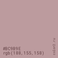 Цвет #BC9B9E в цветовой модели RGB обозначается тремя октетами (188, 155, 158) в десятичном формате и #BC9B9E в шестнадцатиричном (hex) формате, которые являются интенсивностью красного 188 (hex BC), интенсивность зелёного 155 (hex 9B) и интенсивность синего 158 (hex 9E).