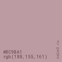 Цвет #BC9BA1 в цветовой модели RGB обозначается тремя октетами (188, 155, 161) в десятичном формате и #BC9BA1 в шестнадцатиричном (hex) формате, которые являются интенсивностью красного 188 (hex BC), интенсивность зелёного 155 (hex 9B) и интенсивность синего 161 (hex A1).