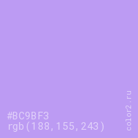 Цвет #BC9BF3 в цветовой модели RGB обозначается тремя октетами (188, 155, 243) в десятичном формате и #BC9BF3 в шестнадцатиричном (hex) формате, которые являются интенсивностью красного 188 (hex BC), интенсивность зелёного 155 (hex 9B) и интенсивность синего 243 (hex F3).